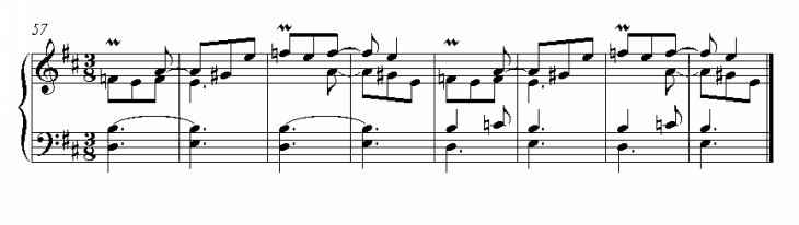 So manches Mal geht Scarlatti zur Dreistimmigkeit über, indem er die Töne einer Linie so verlängert, dass sie einander überlagern, z.B. in der