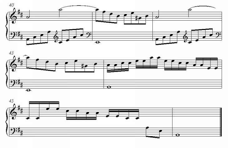 zu finden. Es betrifft auch hier eine zweiteilige Sonate und der A-Teil verläuft "ganz normal". Dieser Teil beginnt in A-Dur und endet auf der Dominante E-Dur. Der B-Teil steht in a-moll und beginnt auf der parallelen Tonart C-Dur. A-moll ist schnell erreicht und ist die Haupttonart dieses Teiles. Lediglich am Ende erscheint eine kurze Coda, die zu A-Dur zurückkehrt.